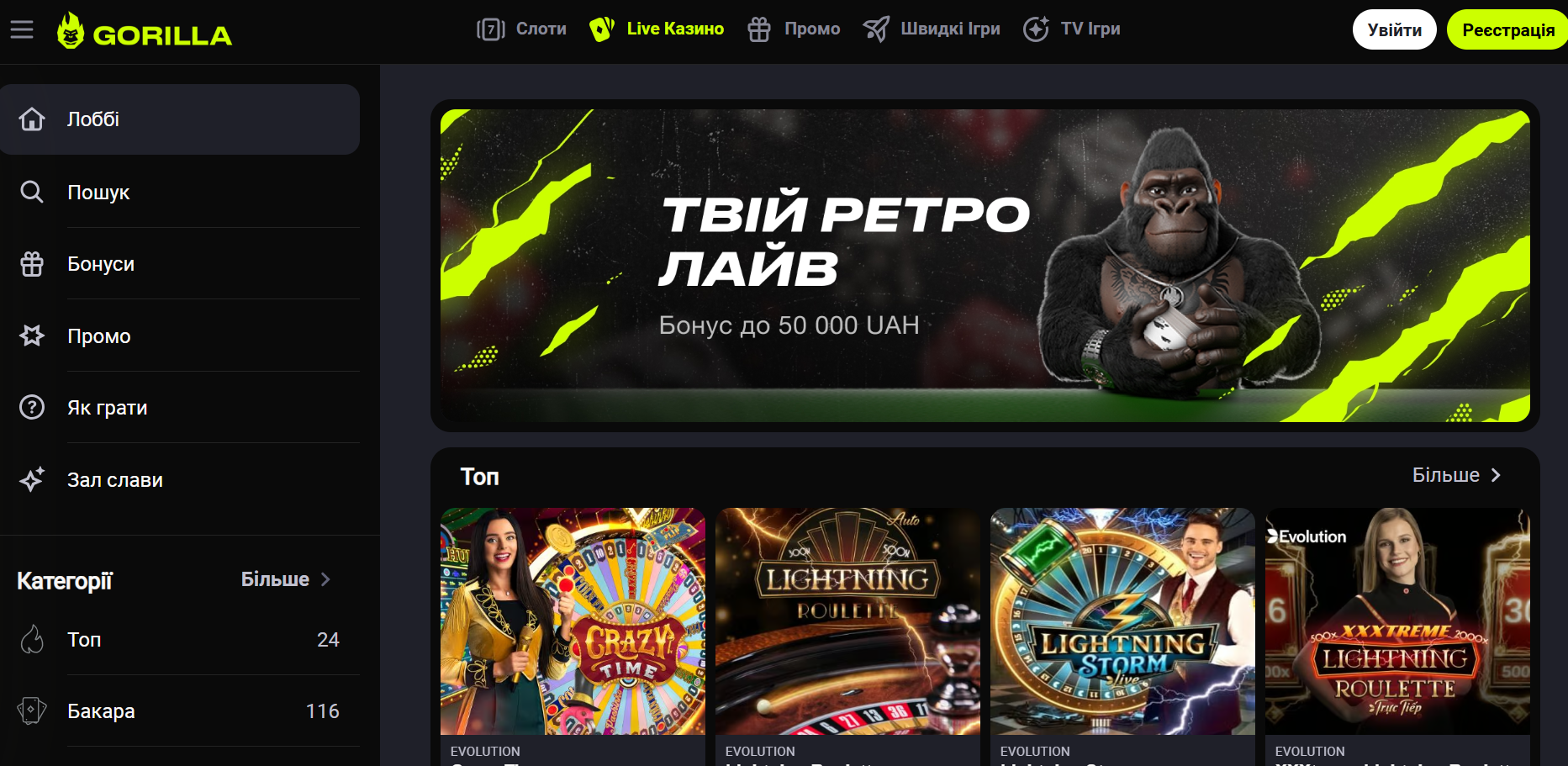 Ці переваги роблять Gorilla ідеальною платформою для тих, хто обирає Live-режим ставок.